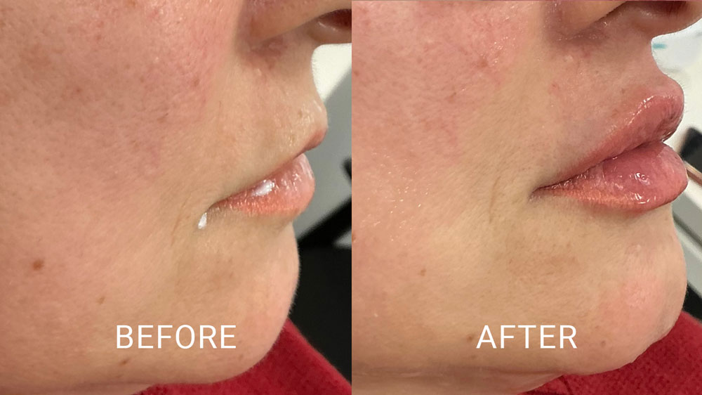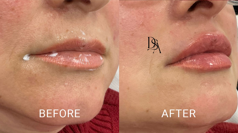 The examples shown below include side-view and front-on lip filler before-and-after images, together with side-view and front-on before-and-after images showing treatment of nasolabial folds and marionette lines. Nasolabial folds are the lines running from the sides of the nose to the corners of the mouth. Marionette lines run downward from the mouth corners toward the chin. Selected before-and-after images show Dr Saraa Al-Yasiri’s treatment work. Individual results vary according to facial anatomy, skin quality and treatment plan.